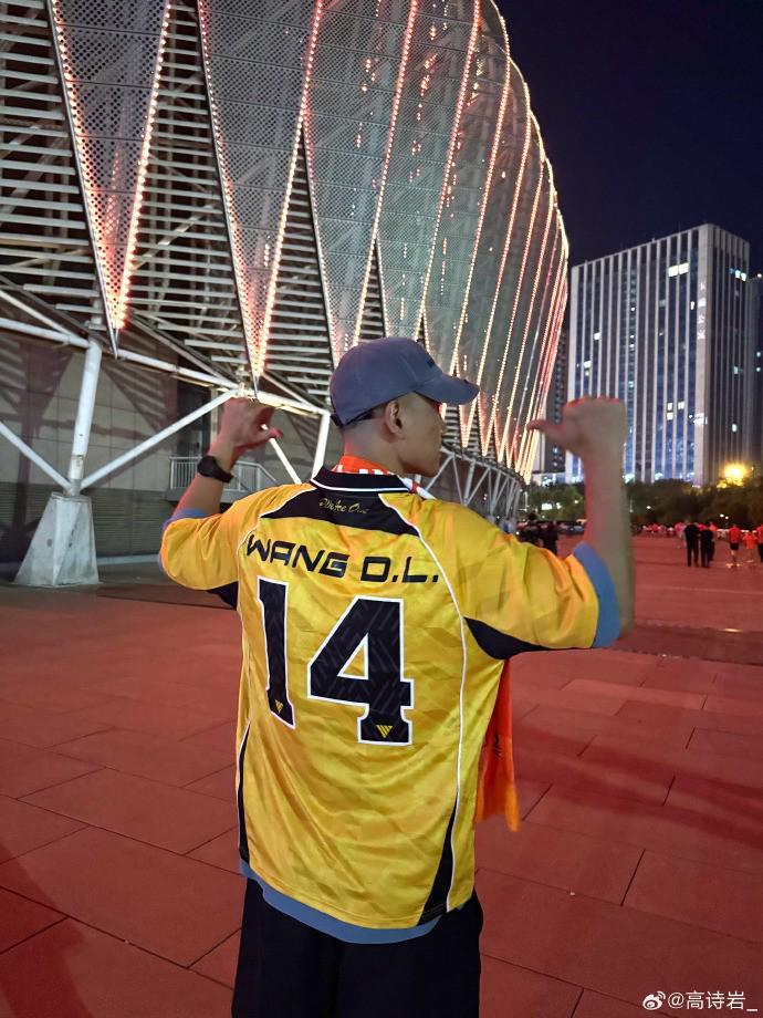 在赛前,高诗岩就被现场报道比赛的媒体拍到,他穿着泰山队的助威服,印着王大雷的14号,还披着泰山队的助威围巾。
